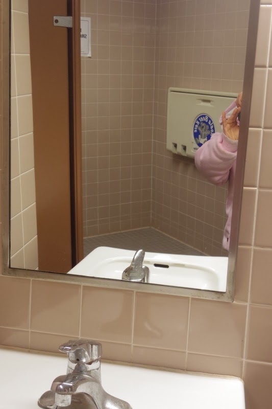 In the evening, I went to my book club meeting at the Grand Island Memorial Library. This is the mirror in the restroom. There’s a changing table, but, other than that, it is a pretty sparse room. |