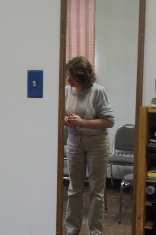 On Sunday, I went to church. In the choir room, there is a full-length mirror. Choir practice is ended, and we are getting ready for the church service. |