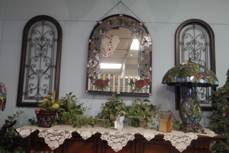This mirror is one of the creations of the folks at Gleam & Glimmer in North Tonawanda, New York. You can see the ceiling and the ceiling lights. When I imagine a bed and breakfast that I would like to run, I visualize a room with this mirror set across from a large bay window with a window set and a view of colorful, lush gardens. |