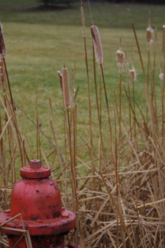 | This is a closer view of the old cattails, with a fire hydrant. It is the juxtaposition between nature and man made things on the land. |