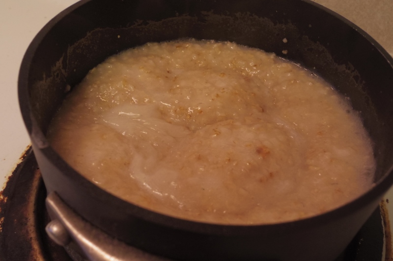 I have been participating in a 20-day vegan cleanse, so no eggs or cheese for me. Also, as part of the cleanse, no dairy products, caffeine, added sugar, alcohol, or wheat. Although that sounds like an exhaustive list of forbidden foods, there are still plenty of foods that are OK to enjoy. Here is my old-fashioned oatmeal cooking on the stove.
