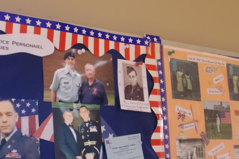 Two men put together a photo display of veterans, who were either members of Saint Martin-in-the-Fields church or relatives of church members.