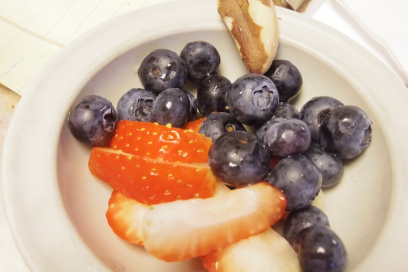 | Toppings for my oatmeal included strawberries, blueberries, and a brazil nut, which I smashed into pieces with a heavy meat tenderizer type of hammer. |