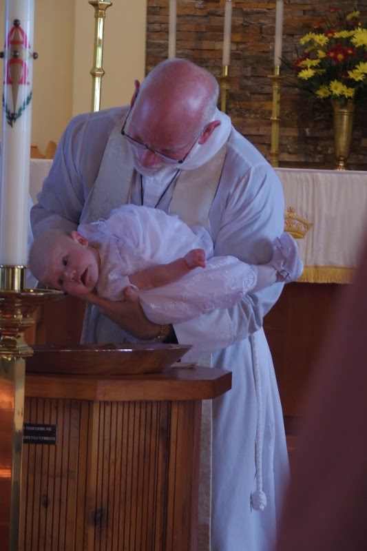 | Father Earle King baptizes a baby. |