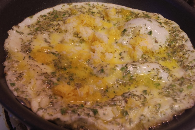 There’s nothing like starting the day off with a nutritious, delicious breakfast. For my mother, I made an omelet. She likes her omelets made with liquid egg whites, rather than the whole egg, and grated cheddar cheese. Here is the omelet cooking on the stove.