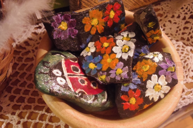 These are the rocks that I painted this past summer. I gave them to Vivian for her birthday. This is how she displayed the rocks.