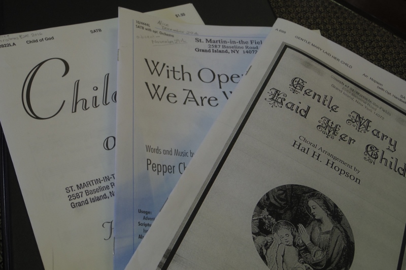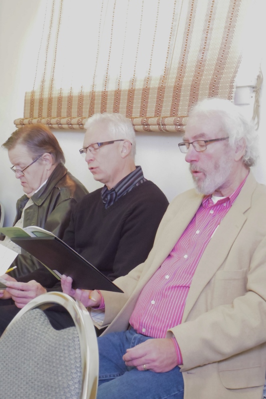 The bass section practices a solo passage for basses and tenors. They practiced this passage at the end of the rehearsal. All of the sopranos and altos left to enjoy a few minutes of socializing before church. This soprano stayed to listen to the men sing and to take pictures.