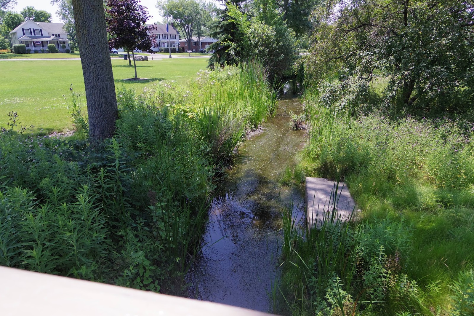 The foot bridge goes over a creek. I think that it is Woods Creek. It goes through the Town Commons. The banks of the creek are preserved as an example of what the riverbank should look like. As I mentioned in a previous post, the riverbank and the bottom of the creek are called the riparian zone. Planting tall native plants, such as the ones planted here, are the best way to prevent soil erosion and pollution of the creek.