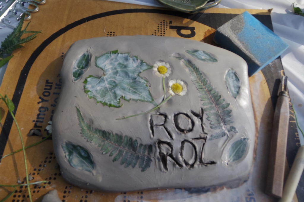 Later in the afternoon, I went to Riverside Salem Environmental Chapel, where we made remembrance pieces in clay. I made two if them. One has my parents’ names, the ones that they always called each other. Sometimes, they just called each other “Y” and “Z.” We pushed the leaves and the flowers into the clay. They will be left on when they are fired, when they will burn away and will leave some color. |