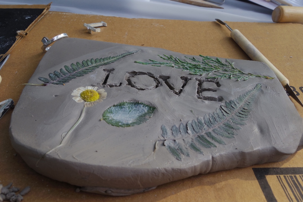 | Later in the afternoon, I went to Riverside Salem Environmental Chapel, where we made remembrance pieces in clay. I made two if them. One has my parents’ names, the ones that they always called each other. Sometimes, they just called each other “Y” and “Z.” We pushed the leaves and the flowers into the clay. They will be left on when they are fired, when they will burn away and will leave some color. |