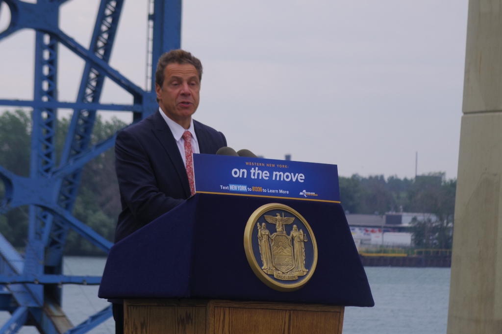 | On Tuesday, I went to Fisherman’s Landing to hear Governor Andrew Cuomo make a Big Announcement about replacing the toll booths at the bridge with Cashless Tolling. This picture of him just shows some of the bridge supports but photographers with more powerful cameras that I have got pictures of him with both bridges behind him. |