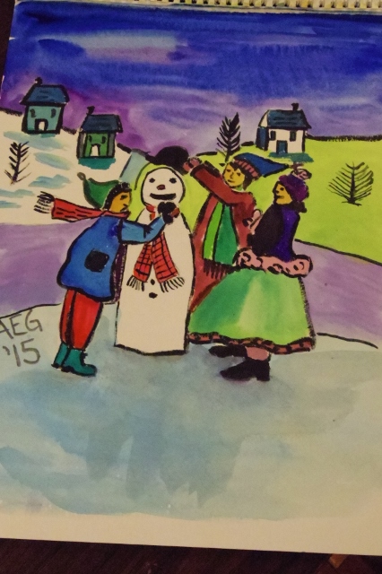 | Here it is! My painting! It was great fun to make it. I chose a “primitive” and “cartoonlike” style for this painting. After the painting session was over, Jinni (the painting instructor) drove me home.
