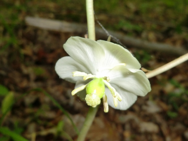 Both of the sites were full of native wildflowers. Above is the flower of the May apple. This apple, Diane explained to me, is not very good as an apple for eating. She said that one of her friends was able to make jelly from the May apple. Plant species that I saw included Solomon seal, trillium, buttercup, wild leek, sedge (a grass), jack in the pulpit, royal fern, Canada mayflower (also known as wild lily of the valley), wild iris, wild geranium, and trout lily. We also observed some invasive species, including barberry, garlic mustard, and periwinkle. |