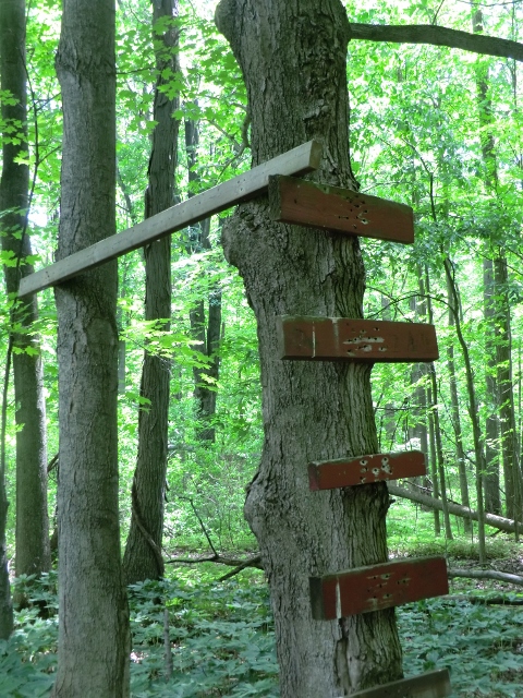 Signs of human activities in the woods include this tree stand. These are used mainly by hunters during deer season. |
