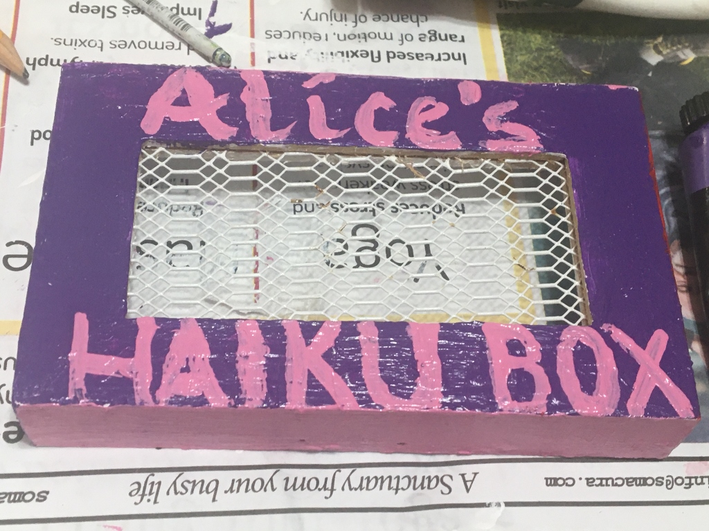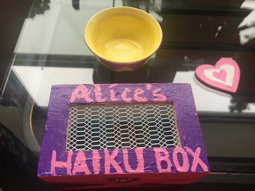 I could think in seventeen syllables. I could say whatever I like but the ideas, my impressions, my stories have to fit the framework of seventeen syllables. I realized that, yes, I can do that. I’m going to write haikus on pieces of paper and place that paper inside the box. So that’s how Alice’s haiku box came about.