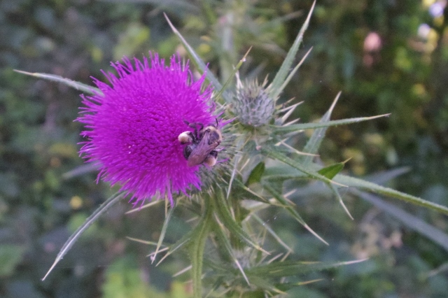 There’s nothing as busy as a bee. The bee has rounds to make and it can’t stop, just because it is Saturday. This one is busy on the flower of a thistle. |