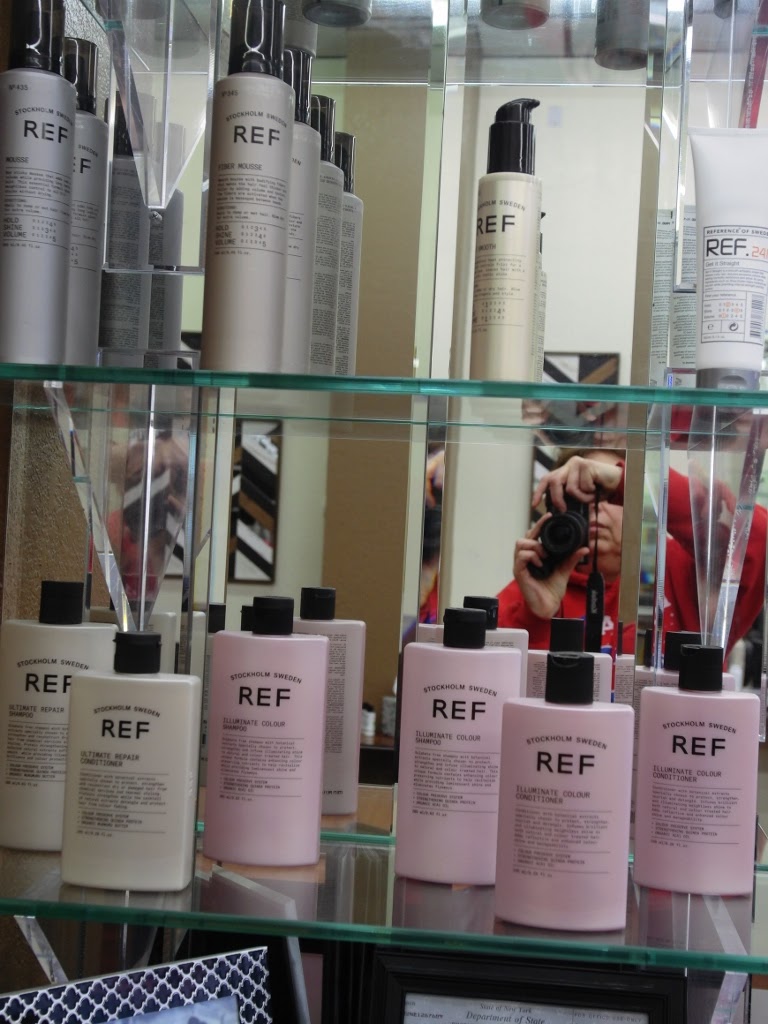 There I am,taking a picture of the array of hair products. Lots of mirrors and glass adds interest to the appearance at a beauty parlor. I find beauty in an expected place. |