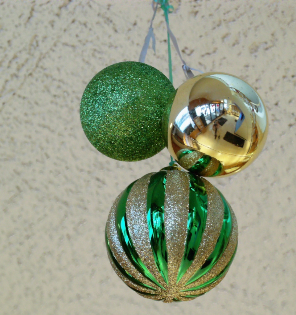 Grand Island Town Hall is decorated for the season. These bulbs are hung near the ceiling of the first floor. Notice how one of these bulbs acts as a mirror for everything going on beneath it.