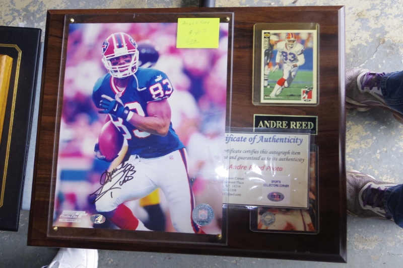 Today is a celebration of small business, called “Small Business Saturday.” People are encouraged to visit their local small businesses today. My friend Diane and I took a little adventure into the world of shopping, here in Grand Island, New York. First, we started with the smallest of all small businesses: the garage sale (the sporadic type of business). The person running the sale was selling various sports memorabilia: signed footballs, football and hockey jerseys, baseballs, and various other professional sports-related merchandise. As you can see from the above portrait of NFL Hall of Famer Andre Reed (wide receiver for the Buffalo Bills from 1985 to 1999 and with the Washington Redskins in 2000), the memorabilia comes with a Certificate of Authenticity.