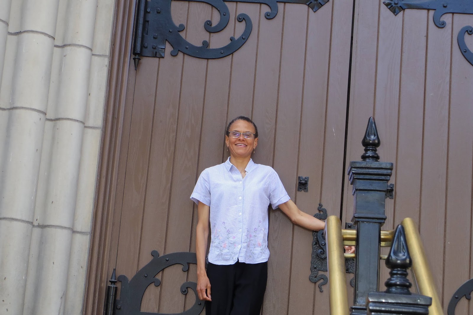Maria enjoys the ornate doors and the camera, which was aimed her direction. |