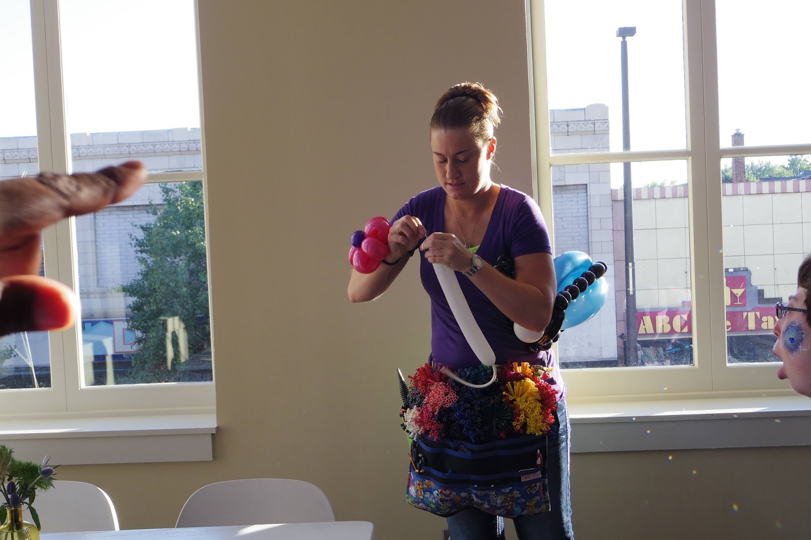 | Lucy’s face painting is complete, and she has a new balloon friend. And now that the face painting is done, it is time to celebrate with delicious ice cream cake! |