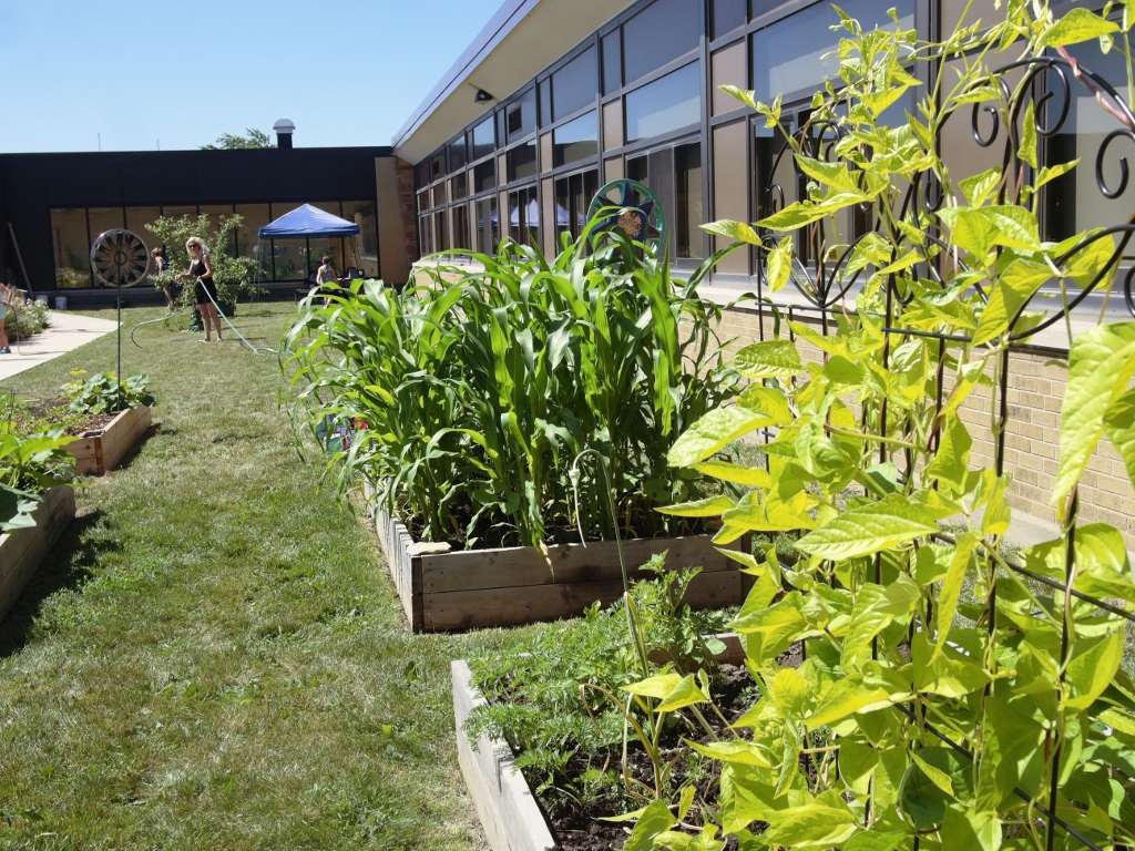 The first garden is maintained by the students of the Kaegebein Garden Club and it includes a pollinator project, as well as raised beds for vegetables and flowers and fruit trees.