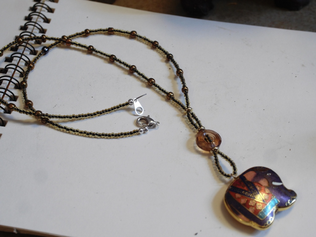 The beads and buttons were beautiful. So much gleam and so many shapes. I put them in a bag and… forgot about them. Recently, however, I found the pendant and, once again, tried to create a design that would attract attention to the elephant. I tried a variety of beads and then… in the collection of garage sale beads, found the beads that I was hoping to find. I had one Swarovski crystal and a bunch of copper-colored beads to add to the necklace, as well.