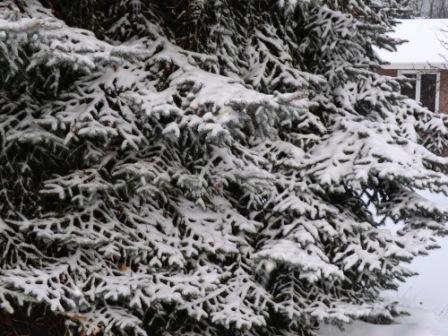 When I come back, I’ll have plenty of stories and pictures to share… with a little bit more color than this one. Yep, that’s the blue spruce in front of my house. Last week, it was covered with snow. It was quite a sight. As I had just acquired a camera, I thought that I would take a picture of the snow-laden tree. So… here it is.