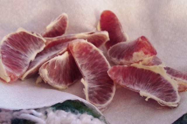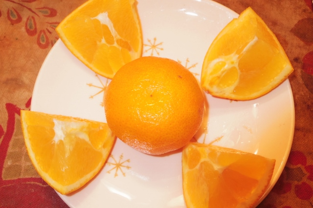 Fruit is very attractive and quite colorful. Here, I have arranged a clementine tangerine and half of a navel orange on a plate. |