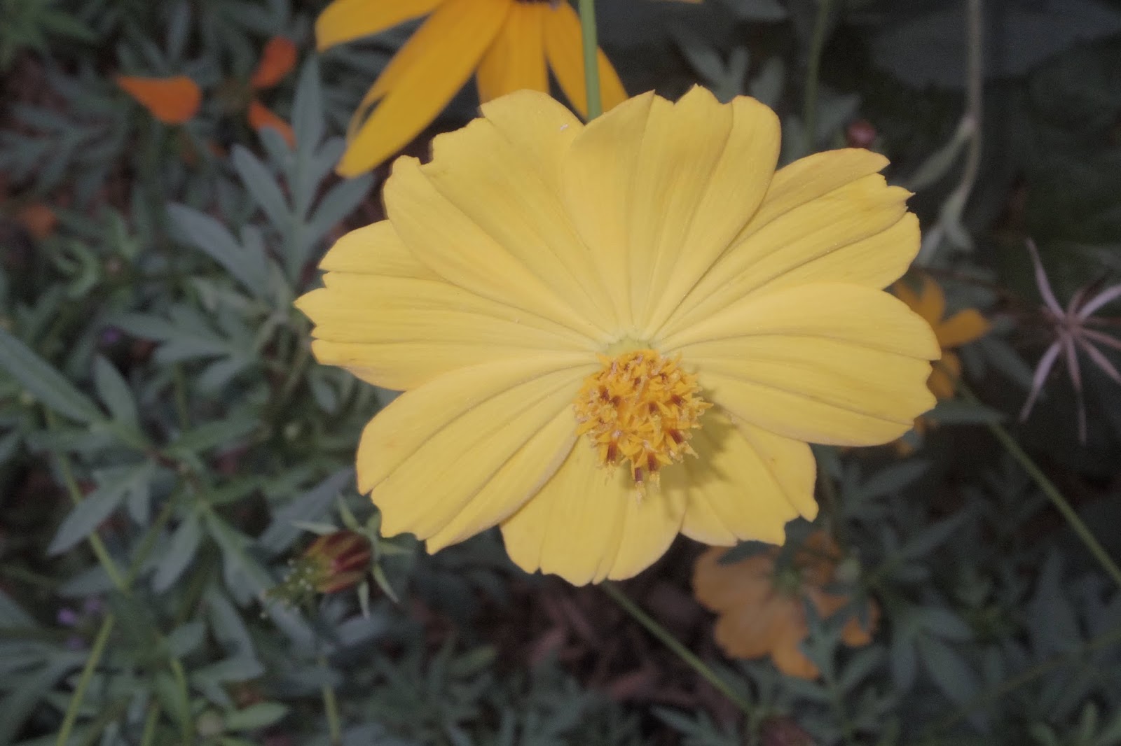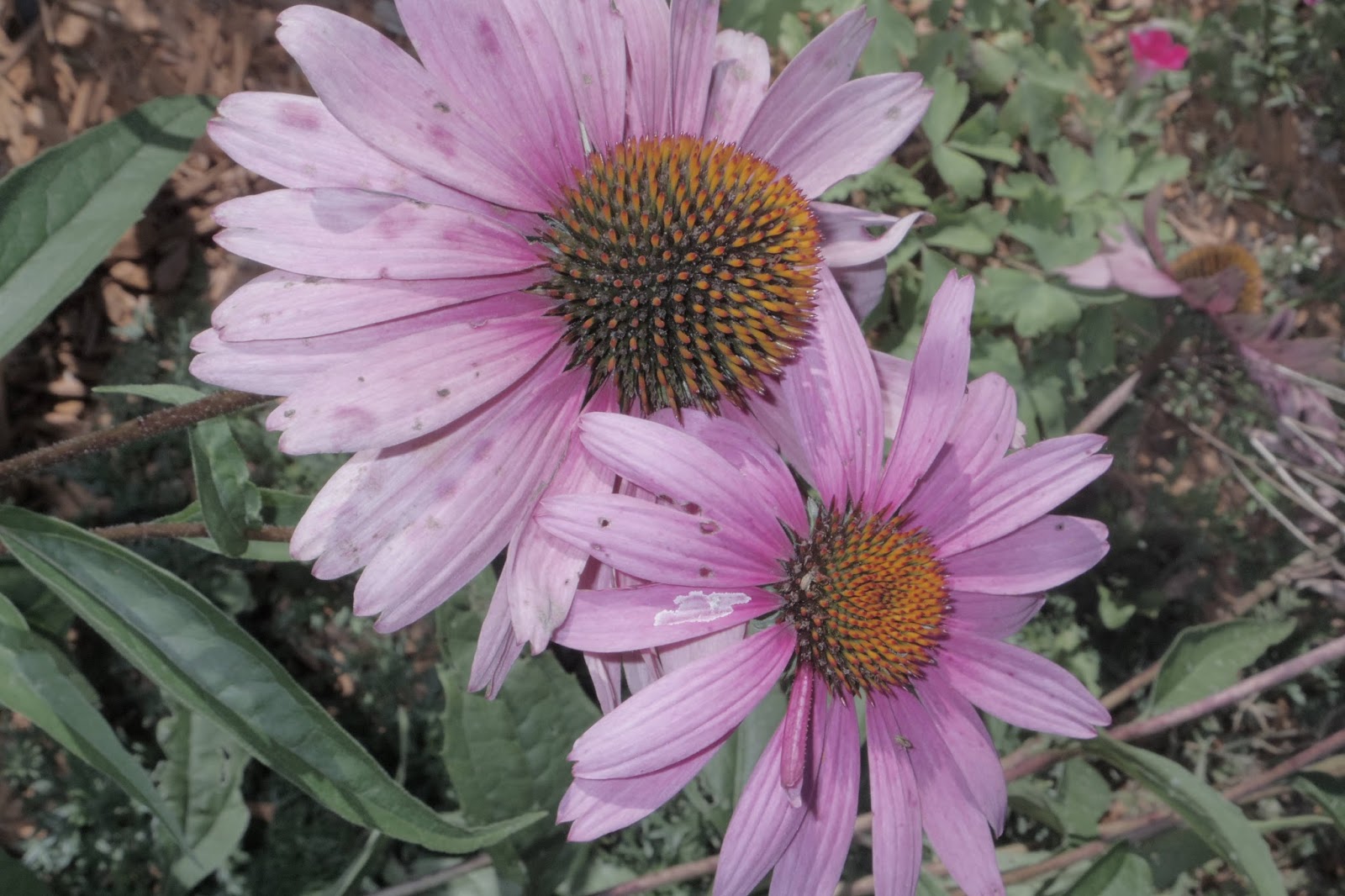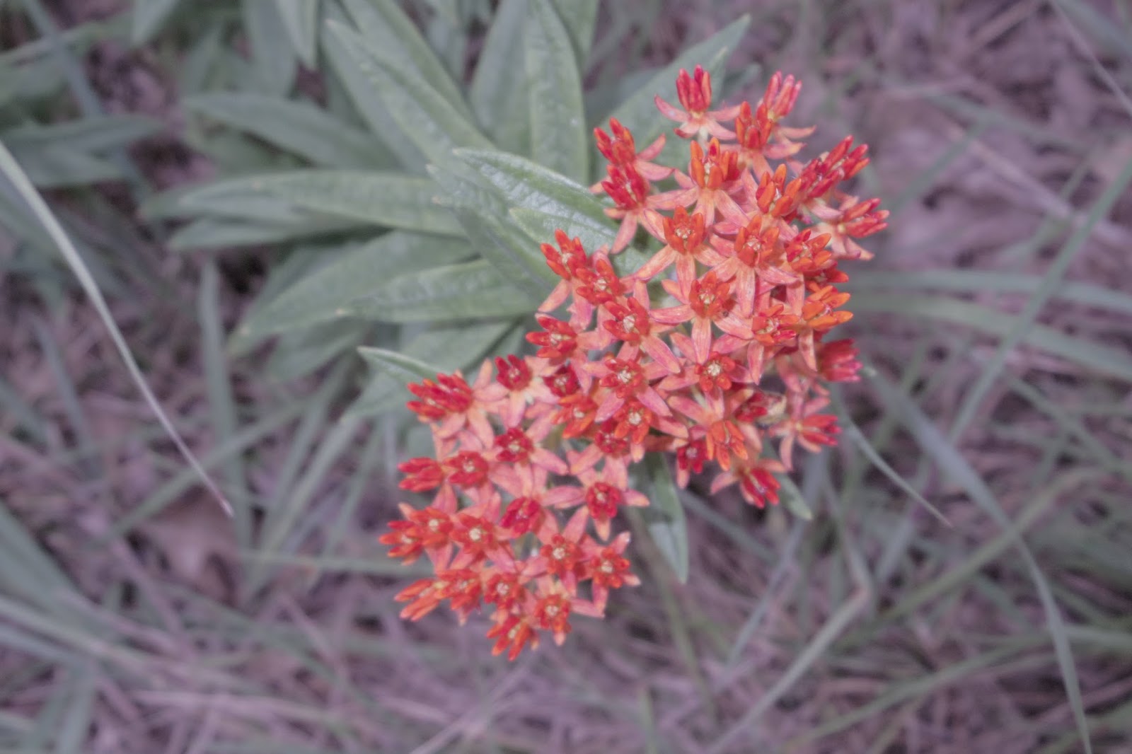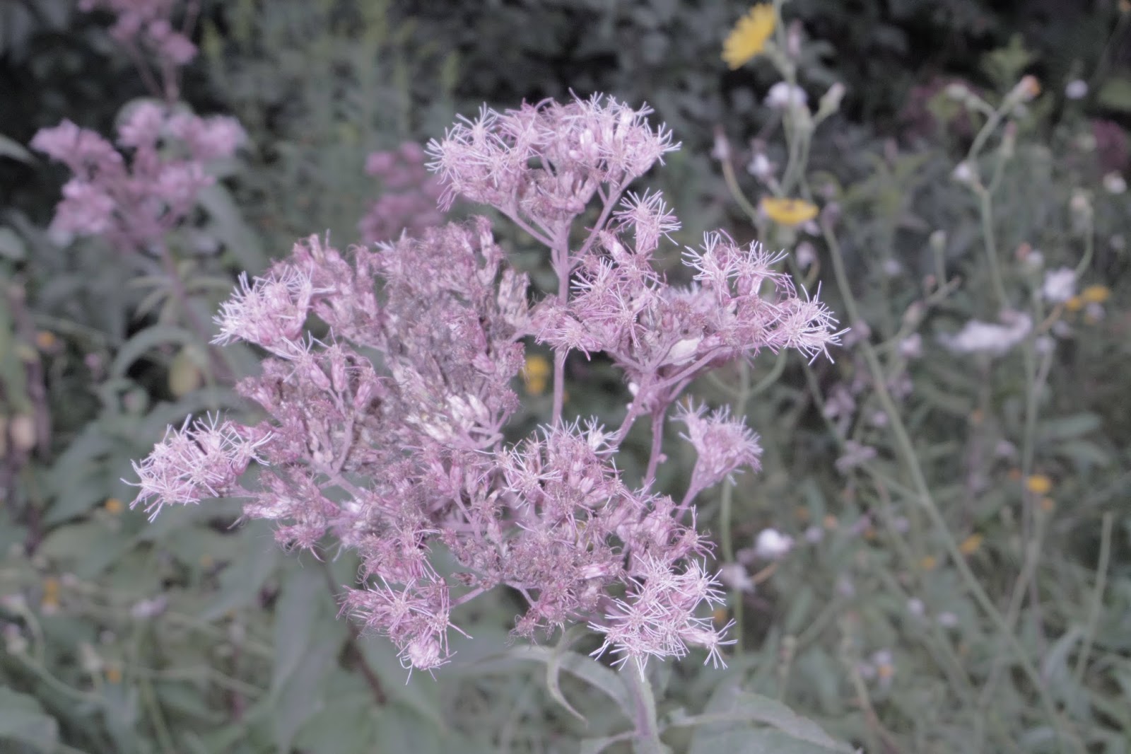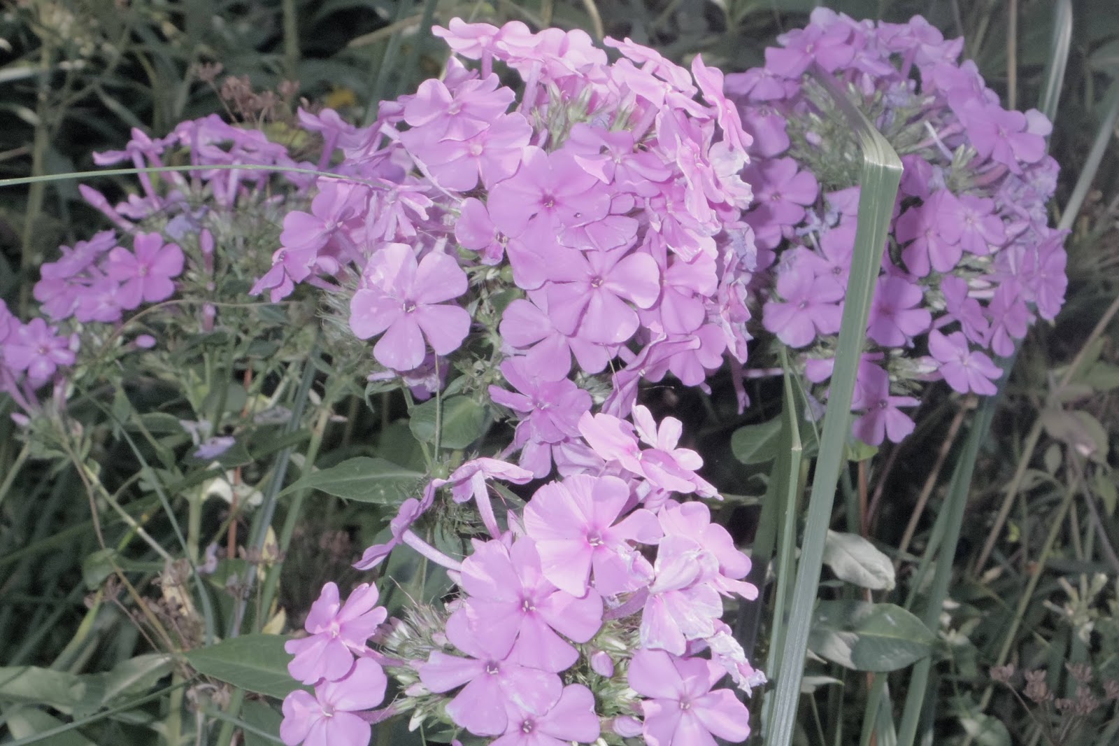 It is now late summer, and the plants are mature. The late flowers are blooming with dramatic color. The pastels of spring are gone, replaced by vivid greens, purples, oranges, and other colors. |