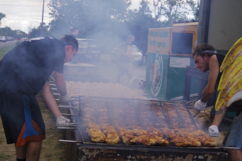 | In front, a few guys cook numerous chickens at one time on a great big barbecue. Here, they are seen flipping the chickens. |