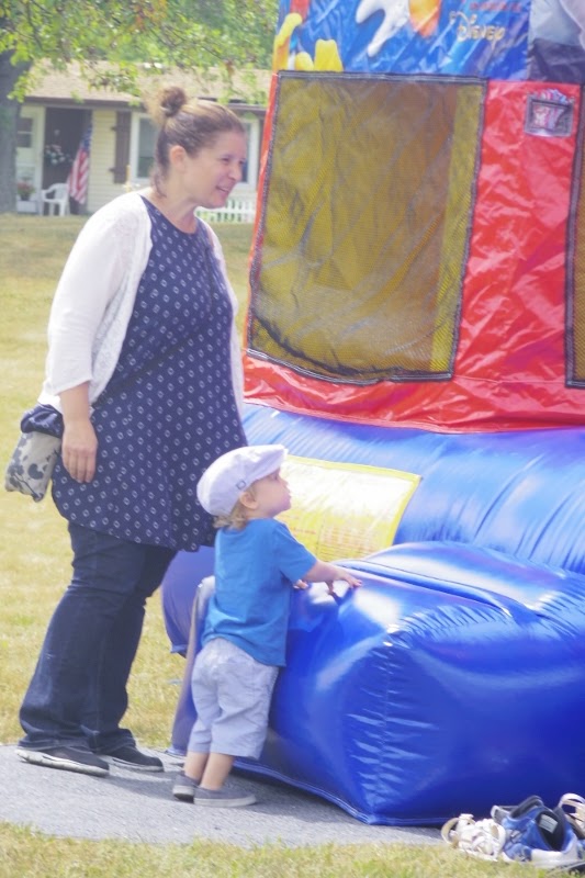 | This little boy has spotted the bounce house and is eager to explore it. |