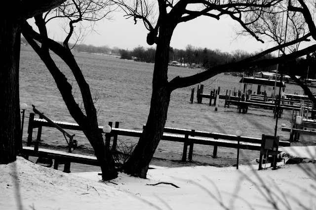 Winter on the river is very quiet. The boats have been put away, and the docks are covered in snow. I chose to use black and white photography for this image, as well as the below image, because I like the interplay between light and shadows.