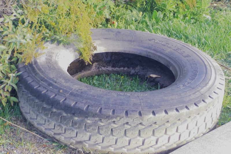 Apparently, this large tire has lost its value so it sits, abandoned amidst the weeds. |