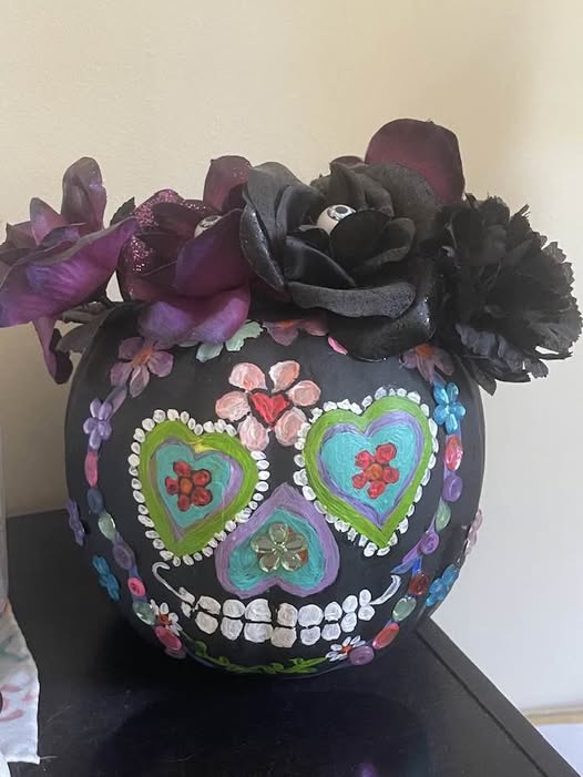 This is what AI has to say about Day of the Dead masks: “Day of the Dead masks, or calavera masks, symbolize death and the cyclical nature of life, representing the idea that death is a celebration of life and a natural part of existence rather than something to be feared. The masks, often inspired by the iconic figure of La Catrina, are worn during parades and festivities to honor deceased loved ones, allowing people to dance with the personification of death, laugh at mortality, and celebrate the bonds that transcend the physical world.”