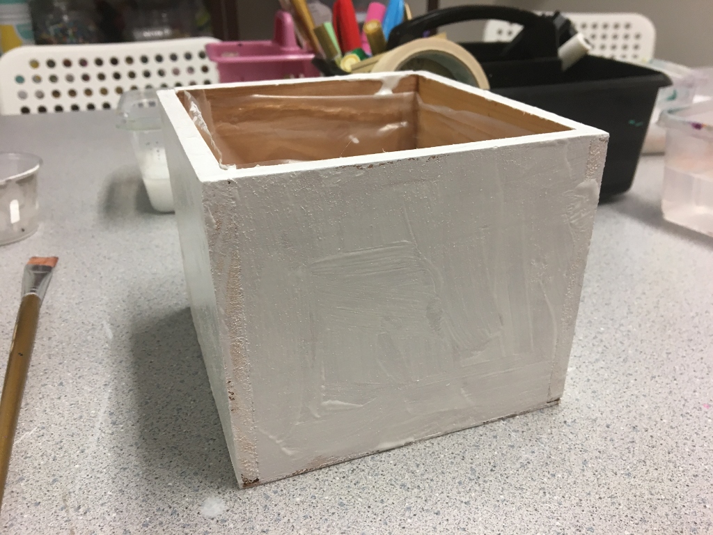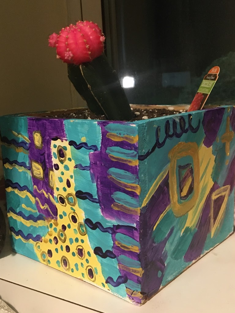 I have to admit, that, for me, not drinking wine is probably a better option because, alas, wine puts me to sleep almost immediately. One glass of wine and I spend about five minutes laughing like a total goofball and then, I’m asleep. The end. That’s all she wrote. So I was unwined, but I was able to unwind. I painted with glee and without expectations. My goal was a planter that reflected a spirit of joy and thankfulness that life is good and I am here to tell the tale.