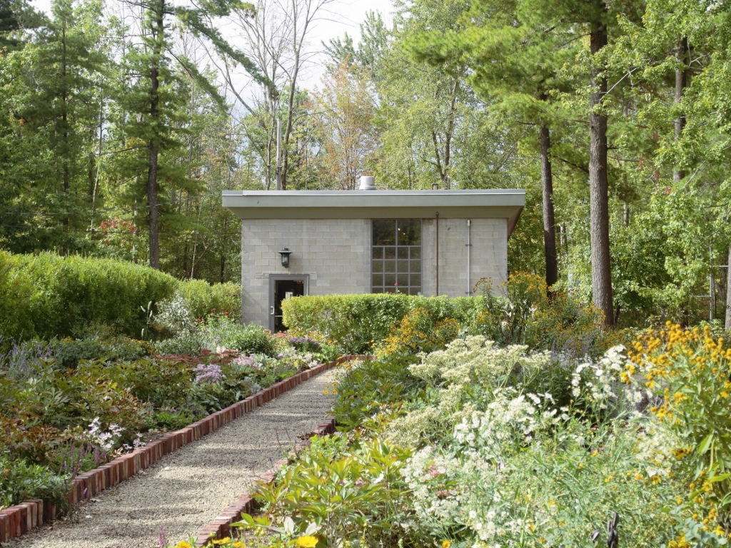 It features large clear windows, overlooking the lake on one side and the gardens on the other, with an irregularly shaped pond.