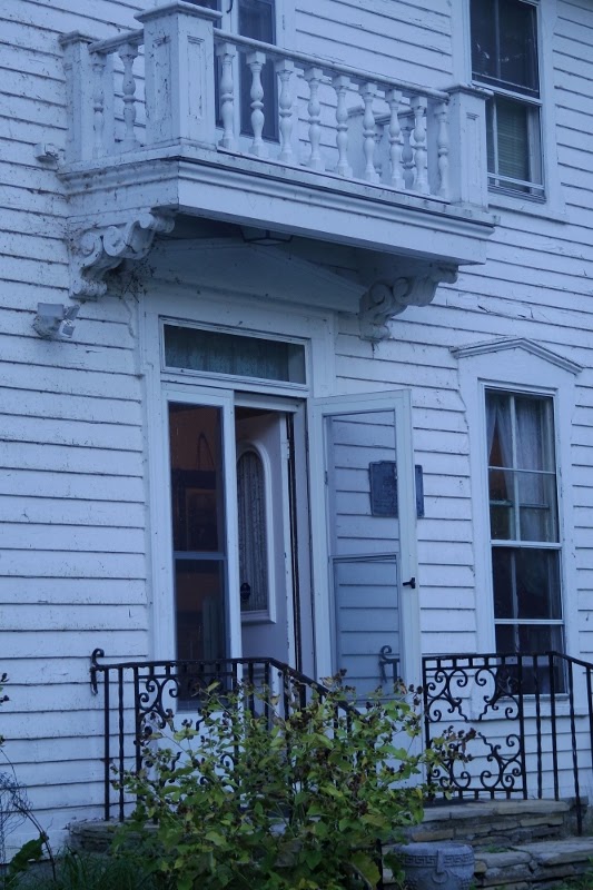 This is the entrance to River Lea. The house was designed by Lewis F. Allen. He was a Buffalo businessman and community leader. Allen Street in Buffalo is named for him. He owned a house in Buffalo that was burned down during the War of 1812. Then he built another house to replaced the torched house. He bought land in Williamsville and had a cattle farm. However, he sold much of that land because it became quite valuable. Later, he bought land in Grand Island and established a farm called Allenton Farms. He had cows and pigs at the farm. He also planted orchards. Fruits that he grew included apples, pears, and cherries.