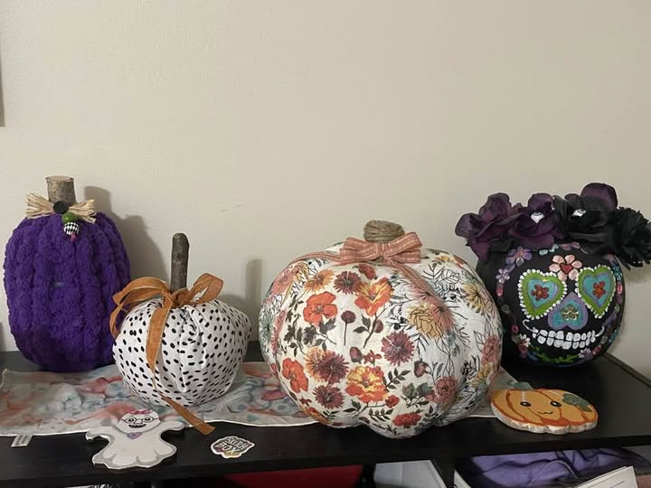 All of those flowers are from napkins that people might bring to an event to share the autumnal colors that they enjoy at this time of year. This was so much fun to make. I got to use scissors and then loads of mod podge. I think that this one will be good friends with the Day of the Dead pumpkin. Here are the pumpkins together, with a few others for an autumnal display. I will probably tweak it a bit tomorrow.