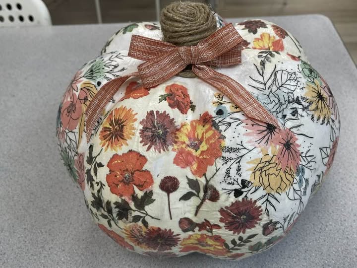 Today, I went to the Orange Poppy Art Studio, located on Baseline Road, across the street from St. Stephen Roman Catholic Church, on Grand Island, for a pumpkin workshop. This workshop was all about decorating a paper mache pumpkin. There were two choices for decorating the pumpkin: paint or decoupage. I already had a pumpkin that I had painted in the past. In fact, it was a Day of the Dead pumpkin. The goal behind creating the Day of the Dead (Dia de los muertes) is to make the skull colorful and vibrant, a joyous memory of those who have passed away. I wanted to create an image full of love, and I hope that I managed to do that.
