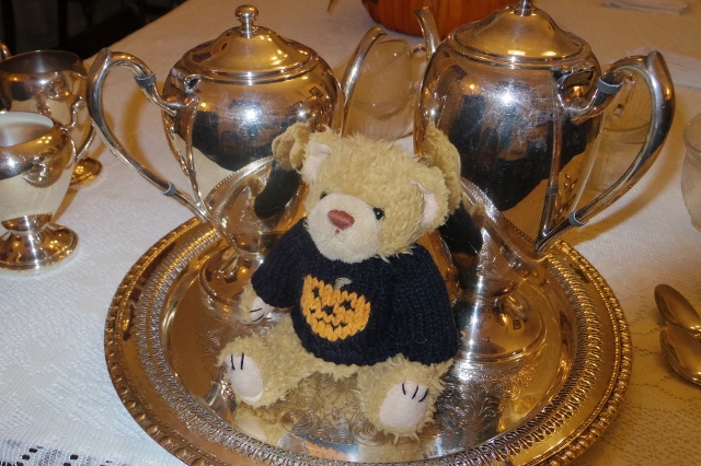 | The bear enjoys the silver at River Lea, the home of the Grand Island Historical Society. |
