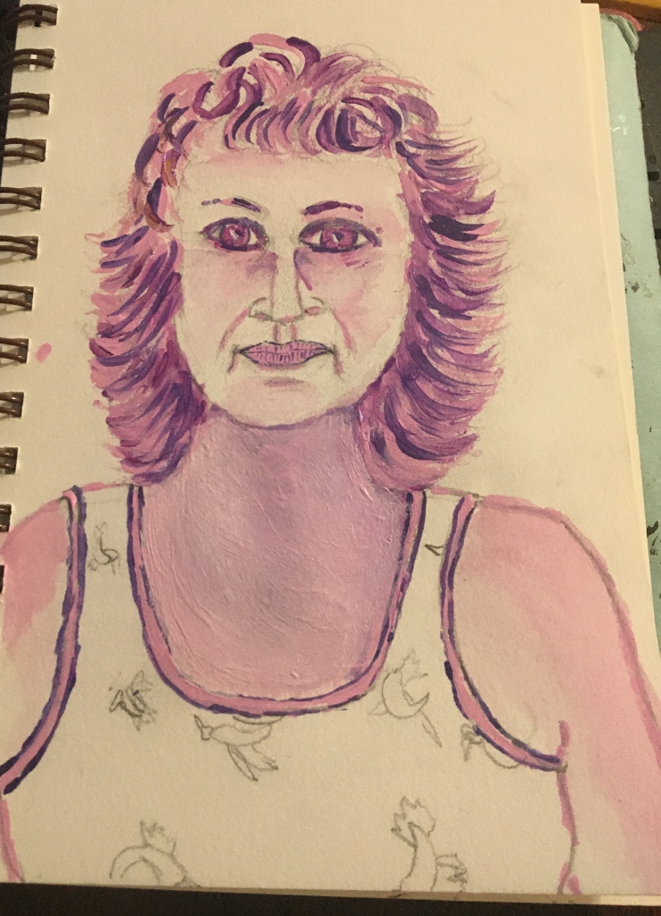 I am currently working on my third self portrait. For this one, I have chosen to only use two colors: purple and pink. It is the most limited palette that I’ve tried yet. It’s a fun experiment so I am sharing the work in progress.
