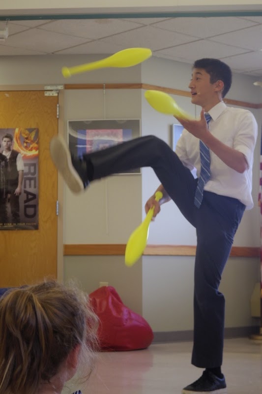 Nels said that his goal is “not just juggling but to uplift an audience. When an audience is uplifted, it uplifts me as well.” During today’s performance, he talked about “trying to do our small part” to make the world a better place. He reminded the audience to have a positive attitude, to be the best, most giving and positive you that you can be, and to have courage. The last thing that he reminded the audience was to remember that they are valuable. “You are valuable and so is the person sitting next to you.”