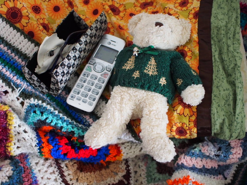 objects: afghan, pillow, eyeglass case, teddy bear, telephone.