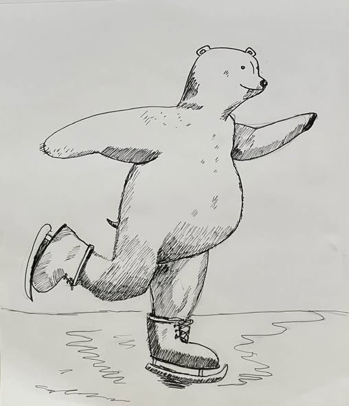 The prompt for week three of Inktober 52 is glide. Which made me think of a polar bear skating on ice that never melts. Here is this happy polar bear on ice skates. He’s looking for an ice dancing partner. I think that polar bears who enjoy ice dancing would be a delightful sight to see, especially if they do the Argentine tango!!!
