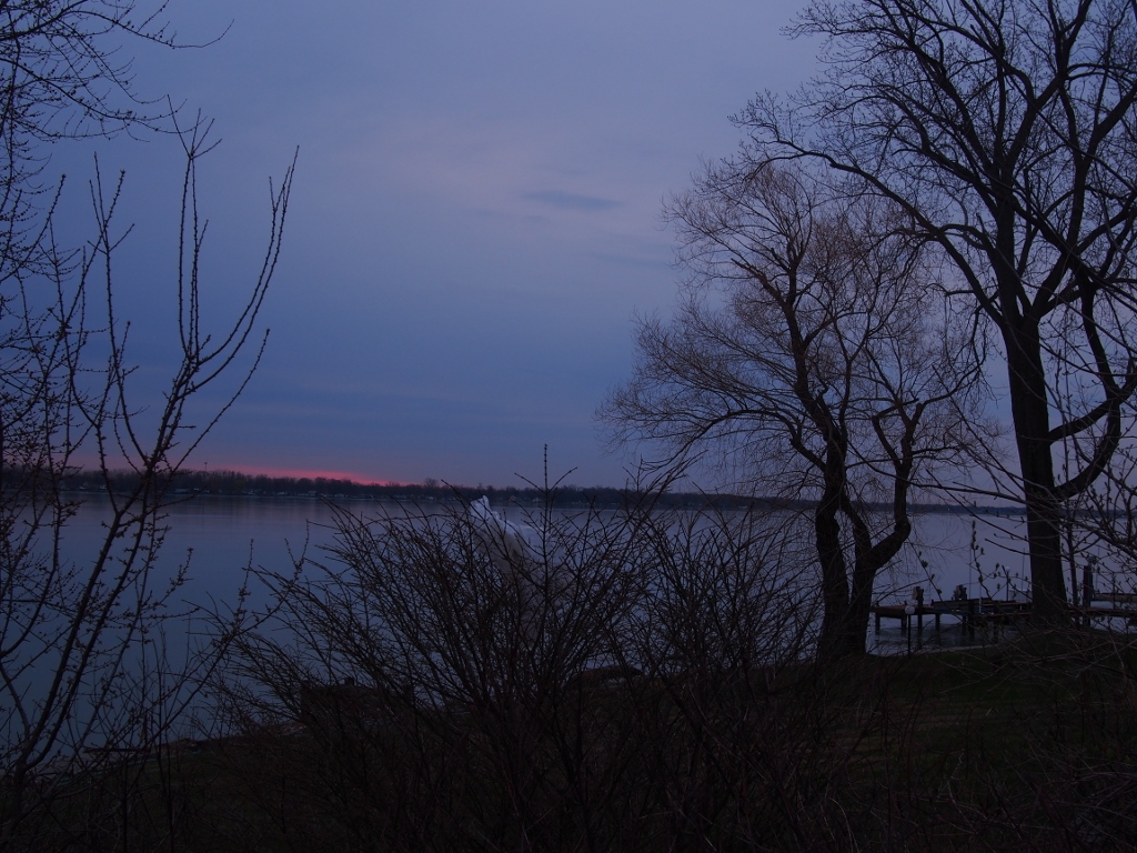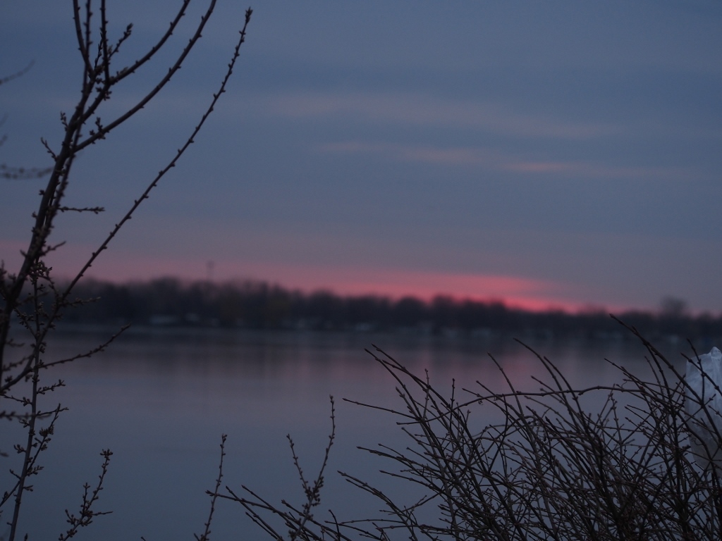 Before long, I was at the river, watching the sun rise. It’s a cloudy day so there was just a bit of redness that faded into the blueness of early morning. And that sky made me happy because it was placid and cloudy, not full of storminess, like it was in January of 1977, when a huge blizzard paralyzed Western New York for more than a week.