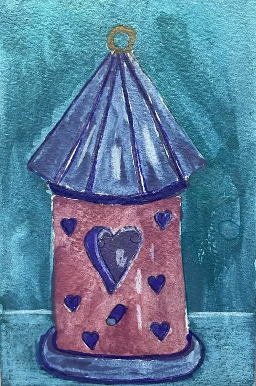 Winter has come with a vengeance, so I stayed at home today and painted. This is a home for love birds. The darkness and dreariness of winter have been fun to watch. In fact, as I write this blog post, I’m watching the snow falling on top of already-copious snow. It’s a great thing to watch from inside. The snow has been pretty. But there isn’t much color. I felt the need for color, so I got out some watercolor paper and some paints, and I painted this image. I chose these colors because they’re bright and fun and happy.