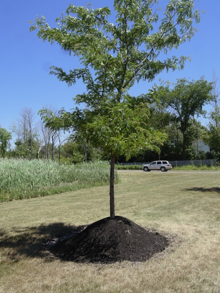 So… what is a good way to mulch around a tree? Well, instead of thinking of a mound, think of a donut. The donut is mulch arranged in a circle around the tree trunk. It doesn’t touch the tree trunk so that the root collar can be visible. And, with a circle of mulch around a tree, the water will be steered toward the tree roots. This should help your new tree thrive and grow tall and strong and, eventually, provide you with good shade.