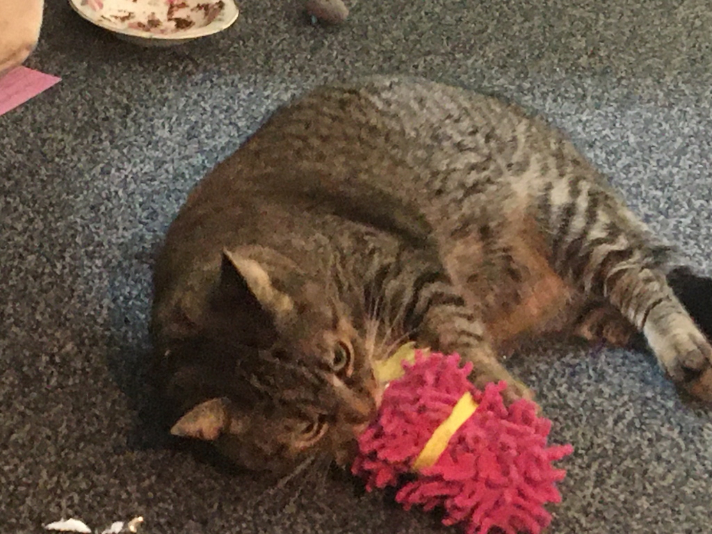 Finally, she gets up, and I decide to test her to make sure that she’s not going to do something else. Like play with that object that she won’t let me use as a chair. Sometimes, she surprises me in the morning by encouraging me to play with my toys. She does that at more appropriate times of day, too. She does try but she’s only a human. So I have to test her a little. I walk between her legs and she is forced to pay attention to me and only to me. It truly is all about me. I’m a cat so I can get away with that. Then she serves me my breakfast. I like pate. Only pate. Don’t give me any of that gravy stuff. No chunks of chicken or anything else yucky that silly humans feed their Cat bosses.