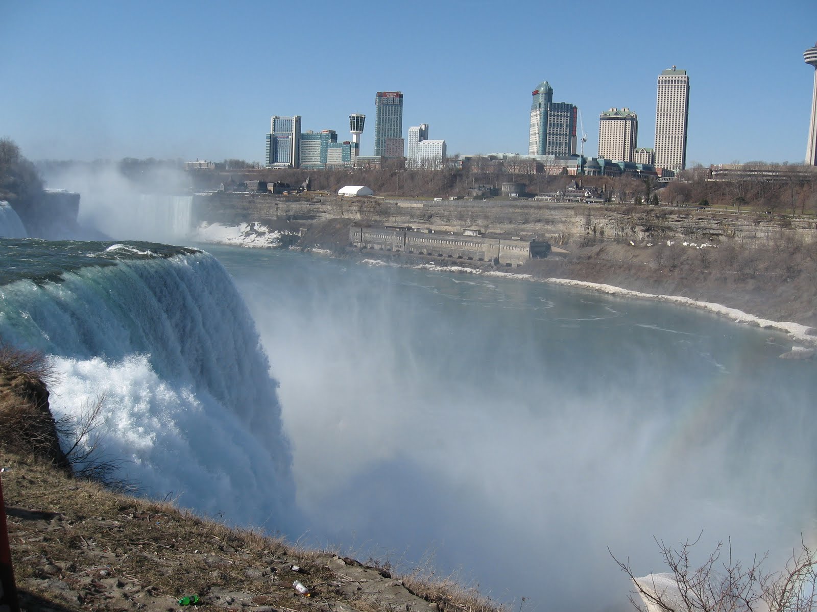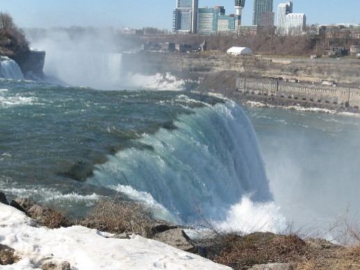 After we left the industrial area of Niagara Falls, located along the Niagara River, we saw downtown Niagara Falls and we also stopped to look at the Falls, one of the seven natural wonders of the world. And a wonder it is. There are always rainbows directly above the falls. We saw some ice and snow still on the ground and the water, despite the warmth of the air and the brilliance of the sunshine.